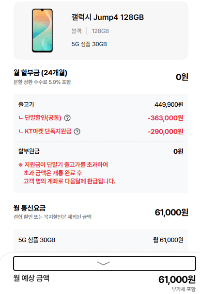 월정액 61,000원 요금제를 선택하고 공통 지원금 296,000원