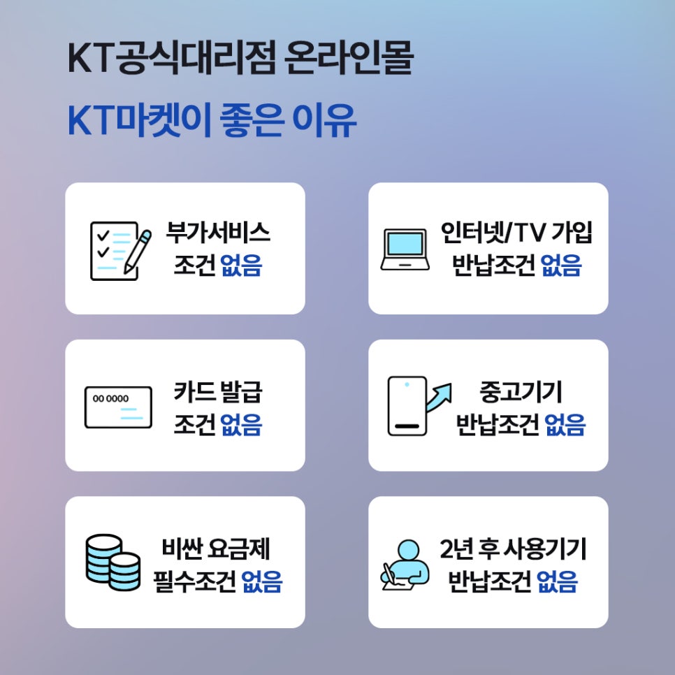 KT마켓에서는 위 해당 모든 조건에 부가서비스 조건, 인터넷TV 가입 조건, 카드 발급 조건, 비싼 요금제 필수 조건, 2년 후 사용 기기 반납 조건 없이 구매할 수 있는 장점이 있지만,