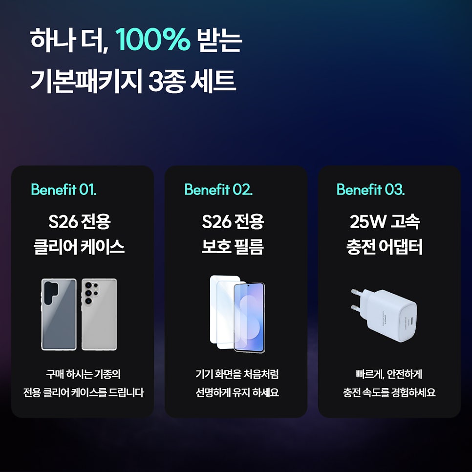 그밖에 100% 증정하는 선물들도 기대해도 좋습니다. 스마트폰을 사용하면서 필수 템인 기본 3종 액세서리 패키지도 증정합니다.