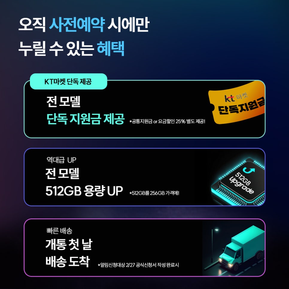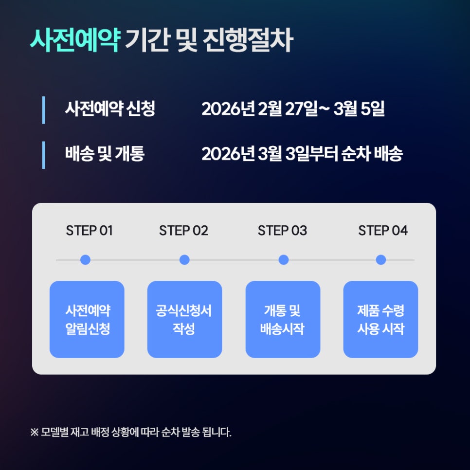 개통 첫날 배송 혜택도 제공됩니다. 2월 27일(금) 사전예약 첫날 공식신청서를 작성하면 3월 6일(금) 개통 첫날 배송, 누구보다 빠르게 신제품을 받아보실 수 있습니다.