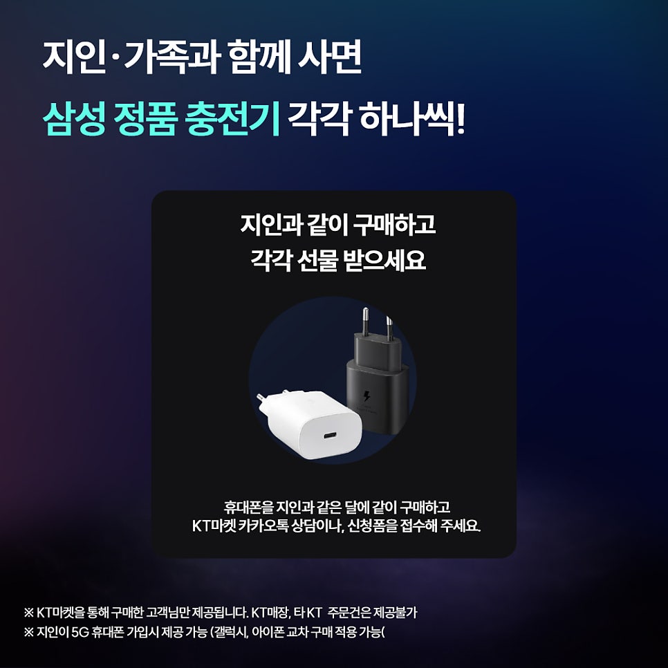 KT마켓에서 갤럭시 S26 사전예약을 가족 또는 지인과 함께 할 경우, 삼성 정품 충전기를 구매하시는 모든 고객님께 제공해 드립니다.