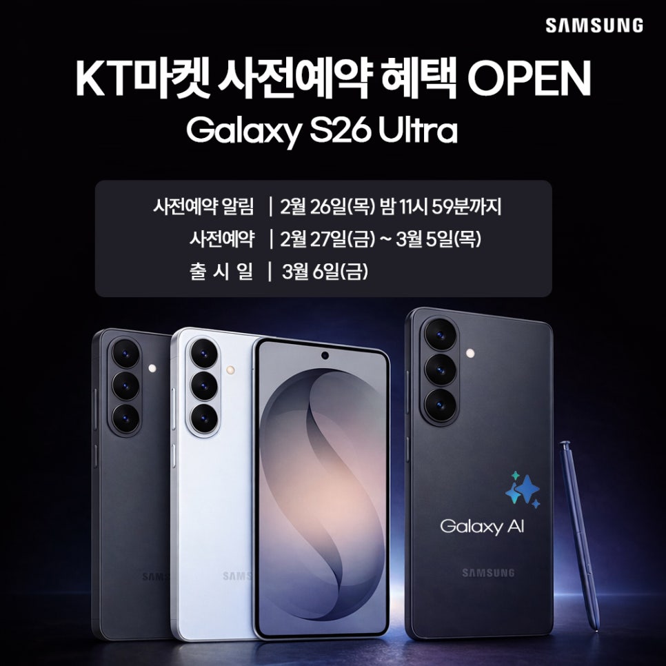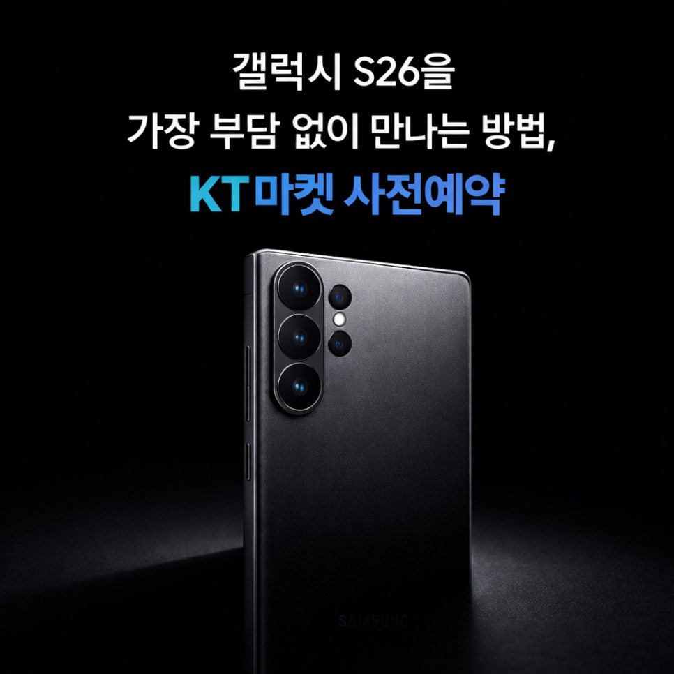 새로운 갤럭시로 갈아타고 싶다고요? 뭐니 뭐니 해도 스마트폰 혜택은 사전예약 혜택만 한 게 없죠. 특히나 갤럭시 S26 시리즈를 구매할 예정이라면 사전예약 혜택이 가장 크다! 자, 지금부터 주목! KT마켓만의 갤럭시 S26 울트라 사전예약 혜택을 소개해 드리겠습니다.