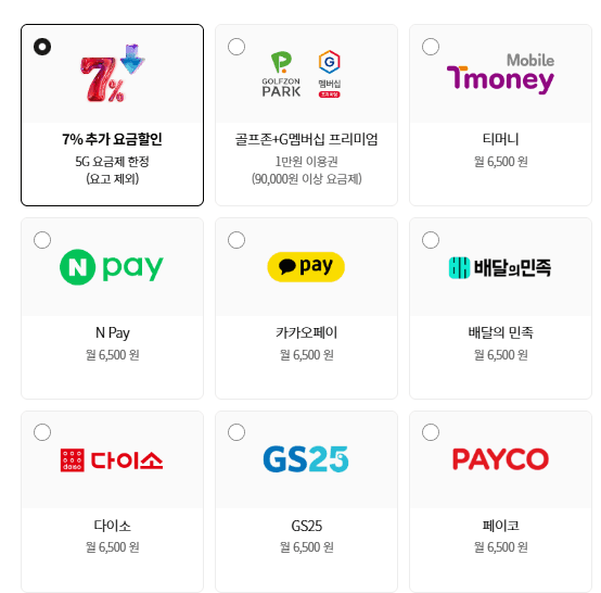 7% 요금할인 프로모션 or 쿠폰팩 중 택 1 등
